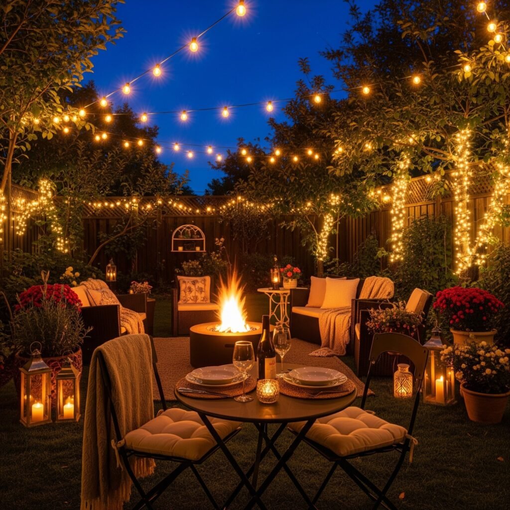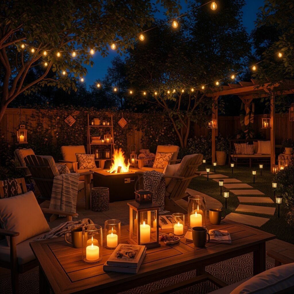 This is where the magic happens. Soft, warm lighting instantly turns a basic backyard into something special. I stick to flameless candles, lanterns, and string lighting so there’s no stress once it gets dark.
